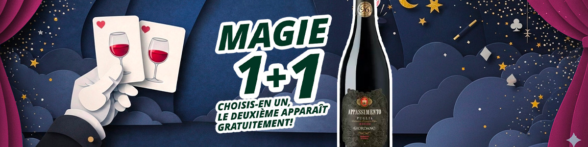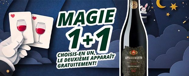 Avec la promo 1+1, choisis un produit parmi la sélection et le deuxième apparaît… comme par magie ! Que ce soit pour un apéritif improvisé, un dîner spécial ou une soirée qui promet des étincelles, ici tu trouves des vins et des spécialités prêts à se multiplier par magie. Un, tu choisis. L'autre… on te l'offre